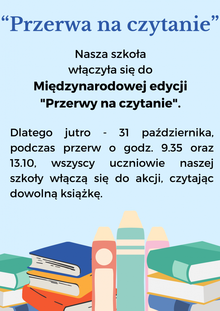 31 października, w ramach obchodów Miesiąca Bibliotek Szkolnych, nasza szkoła uczestniczyła w IV Międzynarodowej edycji VIII Ogólnopolskiej akcji bicia rekordu w liczbie osób czytających na przerwie pod hasłem „Przerwa na czytanie”.
